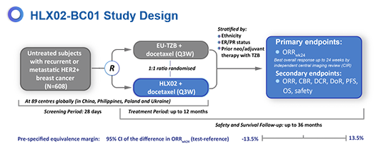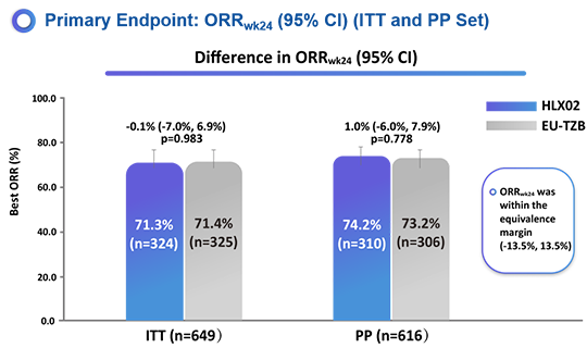 本試驗入組了649例病患(HLX02,N=324;EU-TZB,N=325)。在意向性分析集中,HLX02組的ORRwk24為71.3%,原研組為71.4%,組間差異為-0.1%(95%置信區間:-7.0%,6.9%)。在符合方案集中,HLX02組的ORRwk24為74.2%,原研組為73.2%,組間差異為1%(95%置信區間:-6.0%,7.9%)。ORRwk24組間差異在預設等效區間內(±13.5%)。