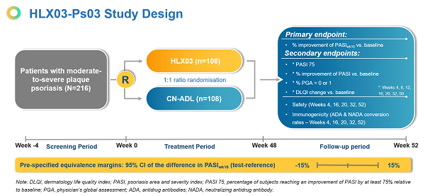本試驗入組了262例病患(HLX03組,n = 132;原研組,n = 130)。在全分析集(FAS)中,HLX03組和原研組PASIwk16相對於基線改善的百分比分別為83.48%和82.02%。兩組的最小二乘差為1.46%(95%置信區間:−3.86%,6.79%),落於預先設定的等效界值(±15%)範圍之內,證明HLX03和原研阿達木單抗的療效相似。