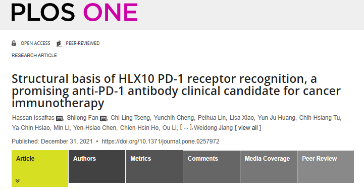 Issafras H, Fan S, Tseng C-L, Cheng Y, Lin P, Xiao L, et al. (2021) Structural basis of HLX10 PD-1 receptor recognition, a promising anti-PD-1 antibody clinical candidate for cancer immunotherapy. PLoS ONE 16(12): e0257972. http://doi.org/10.1371/journal.pone.0257972