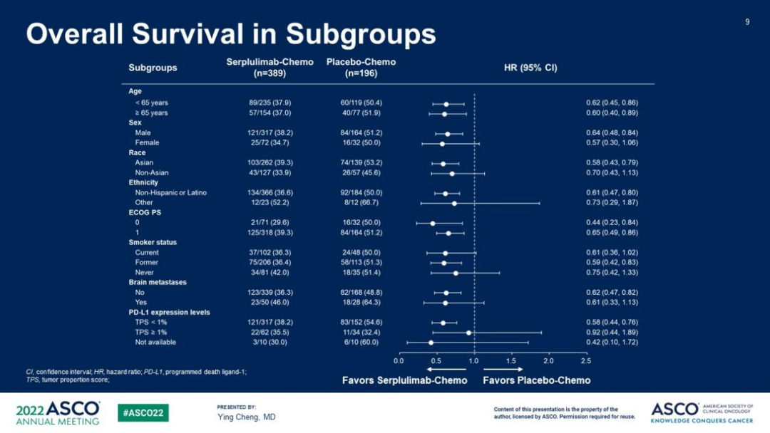 創造ES-SCLC一線治療OS新紀錄,2年OS率超化療組5倍:本次中期分析數據截至2021年10月22日,中位隨訪12.3個月。主要終點結果中,斯魯利單抗聯合組與化療組OS曲線早期持續分離,且前者優勢幅度隨時間推移明顯增加(圖2),中位OS較化療組已顯著延長了4.5個月[15.4個月(95%CI:13.3~NE)對10.9個月(95%CI:10.0~14.3)],突破了既往PD-L1抑制劑的獲益幅度,並創造了ES-SCLC一線治療OS新紀錄,顯著降低死亡風險37%[風險比(HR)=0.63,95%CI:0.49~0.82,P<0.001];12個月OS率分別為60.7%和47.8%,24個月OS率超過化療組的5倍(43.1%對7.9%),即斯魯利單抗聯合組將近一半的患者OS已超過2年。且從OS曲線可以看到,斯魯利單抗聯合組自18個月起曲線就基本平穩,反映出免疫治療特有的「拖尾效應」,意味着這部分患者有望獲得更長生存。所有亞組均從斯魯利單抗聯合化療中獲得顯著OS獲益,包括PD-L1陽性和陰性亞組(圖3)。亞裔人群分析也顯示了一致獲益。