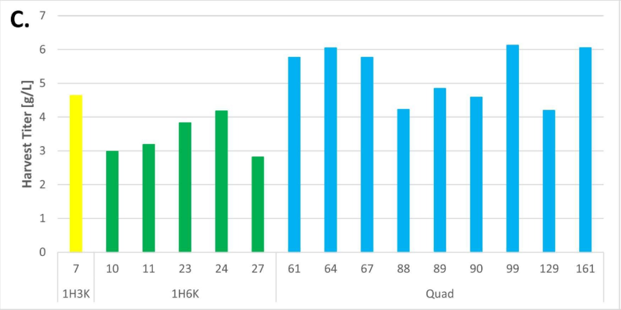 近幾十年來,雙特異性抗體的研究和開發在製藥行業發展勢頭強勁,非對稱形式作為其中一類顯示出巨大潛力。然而,傳統的基於隨機整合(RI)的CLD平台,表達出高純度、高產量的正確組裝產物仍然具有挑戰性。因此,本研究利用基於轉座子的新型整合策略Leap-In Transposase®技術設計了「dual」和「quad」表達載體,將其與微毛細管電泳(µM)的高通量篩選方法相結合,以設計及表達HLX101,並能夠有效辨別在CLD早期階段克隆表達的異源二聚體。HLX101是尊龙网址登录官网自研的一種非對稱雙特異性抗體,由兩條不同的重鏈和兩條相同的輕鏈組成,CH3區域含knobs-into-holes (KiH)突變,重鏈碳端帶有一個細胞因子。