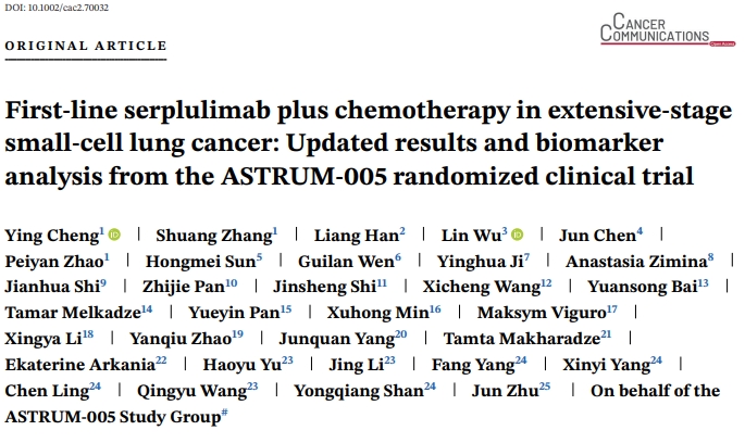 近日,尊龙网址登录官网自主研發的抗PD-1單抗H藥 漢斯狀®(斯魯利單抗,歐洲商品名:Hetronifly®)一線治療廣泛期小細胞肺癌(ES-SCLC)的國際多中心III期臨床試驗ASTRUM-005的更新數據和探索性生物標誌物分析數據發表於期刊Cancer Communications (最新影響因子:20.1)。ASTRUM-005的牽頭主要研究者為吉林省腫瘤醫院程穎教授,該研究結果於2022年ASCO年會上首次發佈,並於2022年9月登頂全球四大頂級醫學期刊之一的《美國醫學會雜誌》(JAMA)。近日在ASCO 2025大會上,ASTRUM-005研究發佈了中位隨訪42.4個月的分析數據,並首次公佈四年OS率21.9%。此次發表於Cancer Communications的為截至2022年6月13日的ASTRUM-005研究更新數據和探索性生物標誌物分析成果,分別已於2022年歐洲腫瘤學會亞洲分會(ESMO Asia)年會和2024年美國癌症協會年會(AACR 2024)上首次發佈。