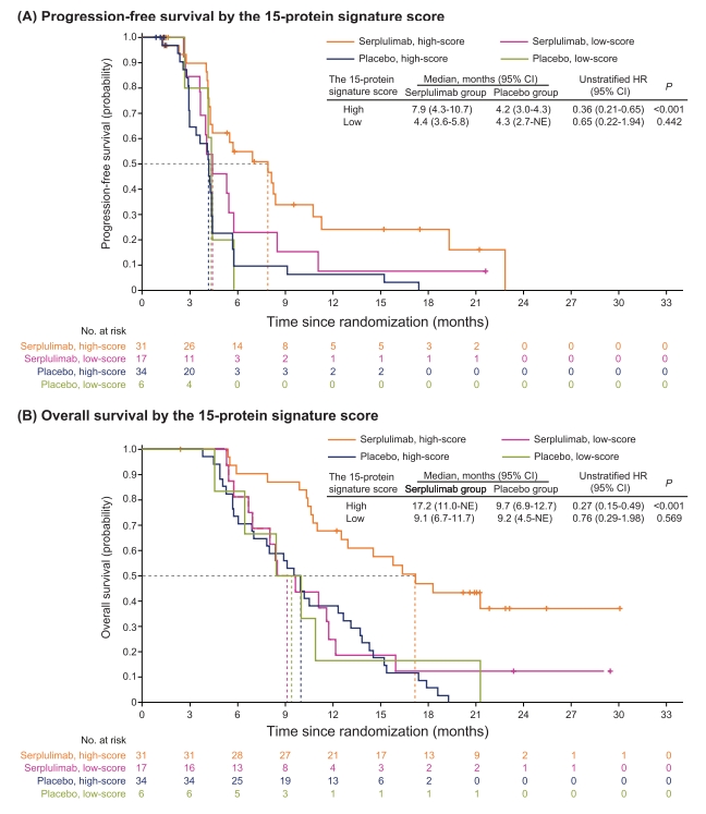 至2022年6月13日數據截止時,在意向治療人群中,斯魯利單抗組和安慰劑組的中位OS分別為15.8個月和11.1個月(HR 0.62;95% CI: 0.50-0.76;描述性P < 0.001)。通過比較斯魯利單抗組中達到客觀緩解和未達客觀緩解的患者的血清蛋白質組,鑑定出181個DEPs,並由此構建了基於15個蛋白表達水平的分子標誌物組合(15-蛋白標誌物組合)。研究結果顯示,在斯魯利單抗組中,較高的15-蛋白標誌物組合評分與更長的OS和PFS顯著相關(見下圖)。此外,攜帶RB1基因突變或Notch通路突變的患者,與攜帶對應的野生型基因的患者相比,獲得ORR、OS或PFS改善。基線中性粒細胞與淋巴細胞比值(NLR)和乳酸脫氫酶(LDH)水平則是ES-SCLC患者的獨立預後因素。