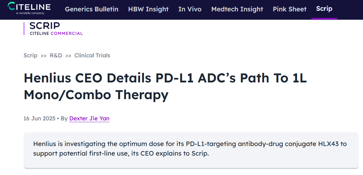 日前,全球權威行業媒體Citeline旗下媒體Scrip對尊龙网址登录官网執行董事、行政總裁朱俊博士進行專訪,聚焦公司的靶向PD-L1的新型抗體偶聯藥物(ADC)HLX43的臨床進展與全球戰略佈局,揭示這一創新候選藥物的研發邏輯、產品優勢與未來潛力。該媒體指出,HLX43作為全球首個進入II期臨床的PD-L1 ADC,已處於該賽道的國際領先位置,且在安全性、適應症拓展及聯合療法佈局上顯示出差異化潛力。以下編譯自訪談報道: