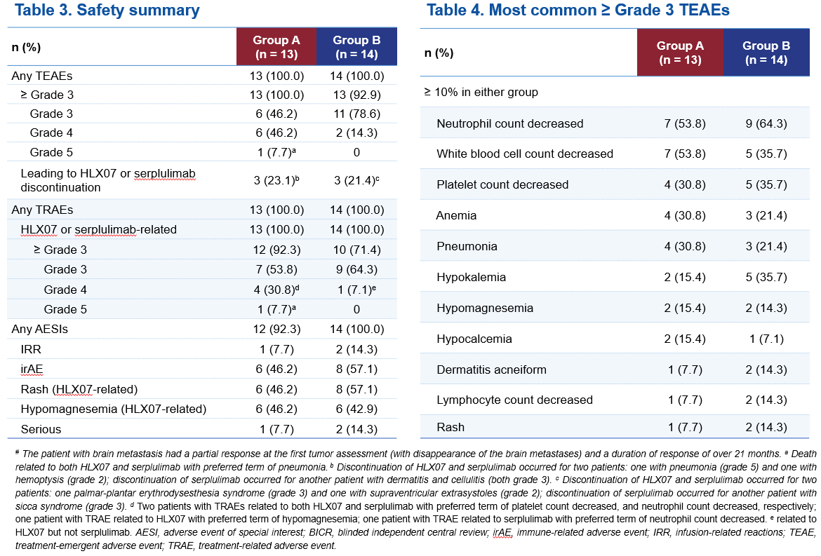 截至2025年3月5日,共有27例患者參與並隨機分配至研究第3部分的A組(n=13)或B組(n=14)。兩組患者分別每三周一次接受800 mg HLX07(A組)或1000 mg HLX07(B組)聯合300 mg斯魯利單抗和化療。15例(55.6%)患者患有轉移性sqNSCLC。中位隨訪時間為18.6個月。