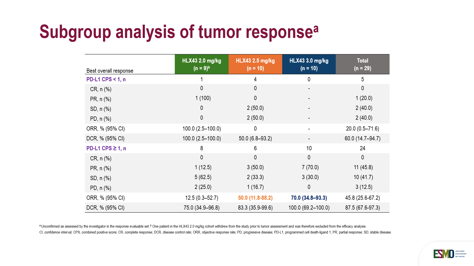 截至2025年9月1日,本研究共納入30例患者,隨機分配接受劑量為2 mg/kg(n=10)、2.5 mg/kg(n=10)和3 mg/kg(n=10)的HLX43治療。其中超過80%的患者PD-L1綜合陽性評分(CPS)≥1。 患者既往接受腫瘤治療的中位線數為2.0(範圍1–4線)。全部患者接受過鉑類藥物化療,60%的患者接受過靶向治療,約50%患者接受過免疫治療,中位隨訪時間為3.5個月。