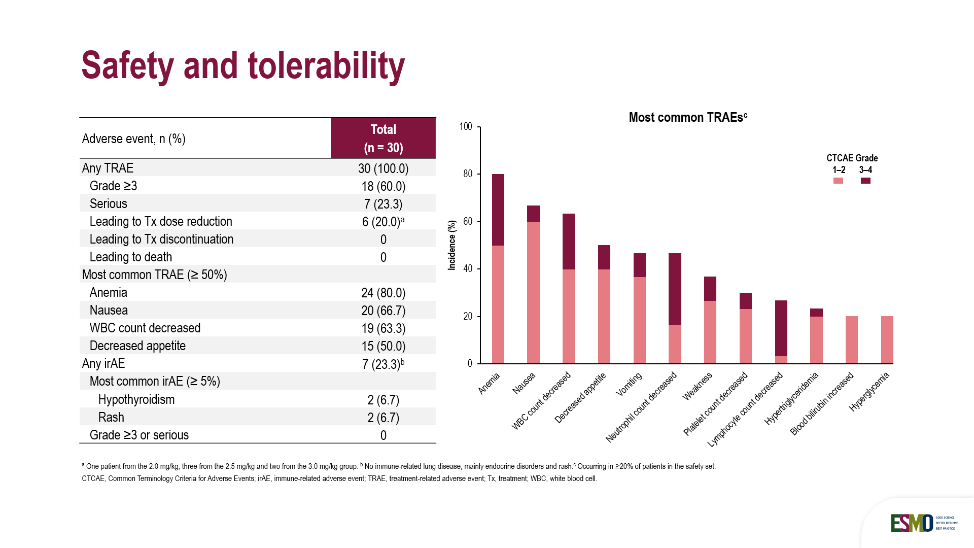 安全性方面,18列(60.0%)患者報告了≥3級治療相關不良事件,主要為可管理的血液學毒性,常見包括為中性粒細胞計數降低(30.0%)、貧血(30.0%)和淋巴細胞計數降低( 23.3%),6例(20.0%)患者因TRAE導致劑量減少,無TRAE導致的患者停止治療(導致停藥的TRAE發生率為0%),且無TRAE導致的死亡。其中,7例(23.3%)患者發生免疫相關不良事件(irAE),主要包括甲狀腺功能減退症等內分泌異常、皮疹等。無患者報告≥3級免疫相關不良事件(irAE),提示了HLX43的IO療效,且免疫相關毒性溫和,具有可控的安全性特徵。
