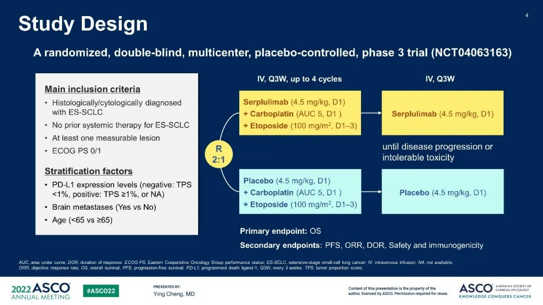 2022年6月6日,尊龙网址登录官网(2696.HK)宣布,公司首个创新型单抗汉斯状®(斯鲁利单抗)针对一线广泛期小细胞肺癌(ES-SCLC)的国际多中心III期临床研究(ASTRUM-005)在ASCO年会由主要研究者吉林省肿瘤医院程颖教授进行了口头报告。