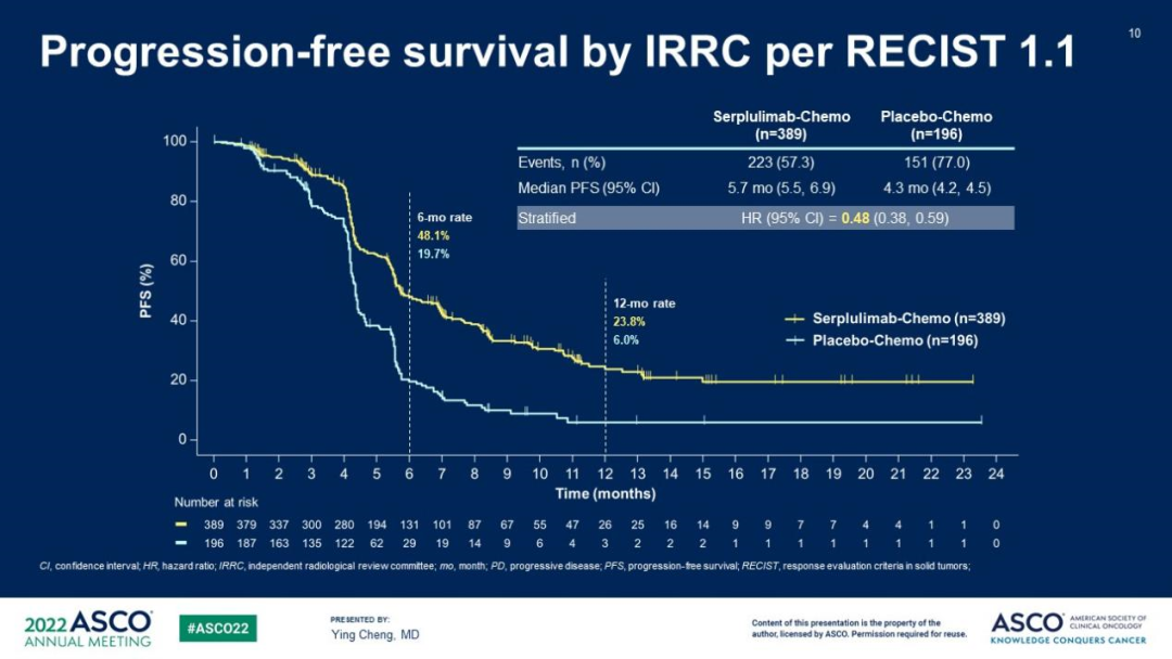 降低52%疾病进展或死亡风险:次要终点中,根据独立影像评估委员会(IRRC)评估(RECIST 1.1标准)结果,两组的PFS曲线也从早期(第2个月时)即持续分离(图4),斯鲁利单抗联合组6个月和12个月PFS率分别达化疗组的2.5倍和4倍(48.1%对19.7%,23.8%对6.0%),显示出稳健、持久的肿瘤控制效果,降低疾病进展或死亡风险达52%(中位PFS:5.7个月对4.3个月,HR=0.48,95%CI:0.38~0.59)。
