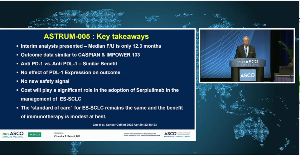 来自宾夕法尼亚州赫尔希癌症研究所的Chandra P. Belani博士点评道(图5),从ASTRUM-005研究提交的中期报告来看,中位随访时间为12.3个月,研究结果与CASPIAN和IMPOWER133研究类似(图6),都取得了非常好的成果,患者都有显著获益,PD-L1表达与患者预后没有直接相关性,同时安全性良好,该研究无新的安全信号产生。