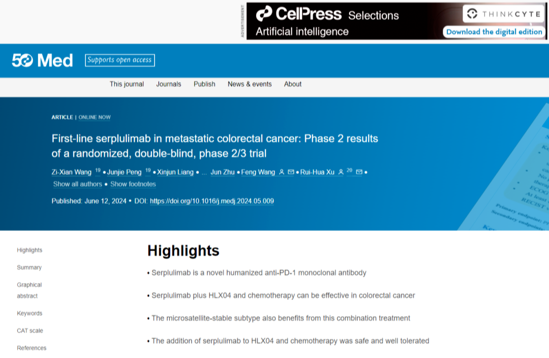 ASTRUM-015研究是尊龙网址登录官网自主研发的抗PD-1单抗H药 汉斯状®(斯鲁利单抗)联合贝伐珠单抗和化疗一线治疗mCRC的II/III期临床研究,其II期阶段研究结果首次发布于2024年美国临床肿瘤学会胃肠道肿瘤研讨会(ASCO GI),其后该研究数据更新亦入选2024年美国临床肿瘤学会(ASCO)壁报展示。此次正式发表于MED,再次体现了国际学术界对H药的高度认可。基于ASTRUM-015的II期阶段研究结果,近期该研究已启动III期临床阶段研究并完成首例受试者给药。