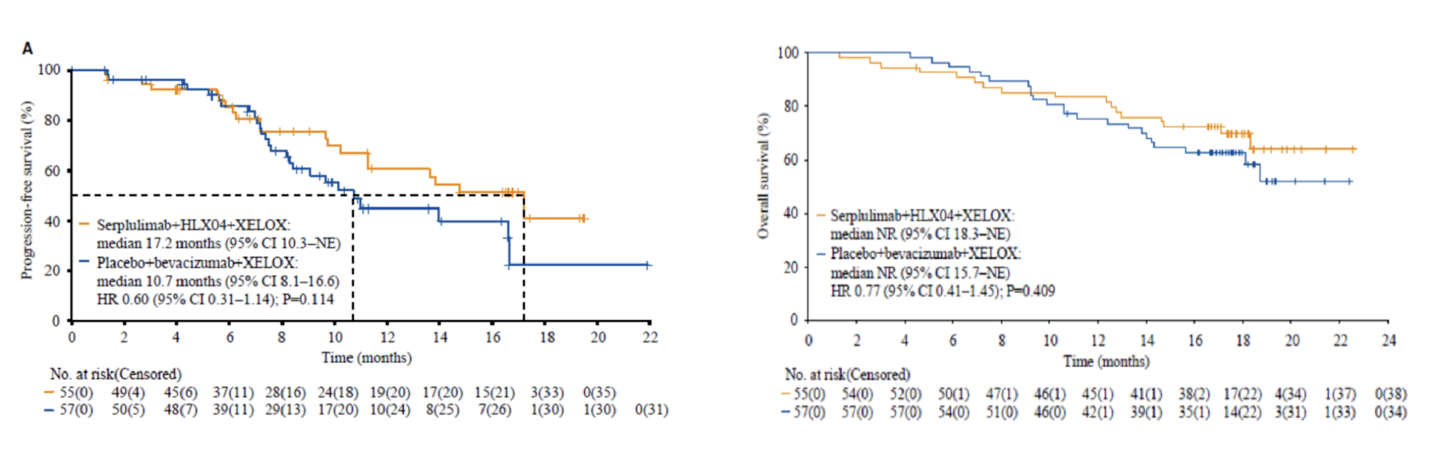 尊龙网址登录官网通过ASTRUM-015研究进一步开展mCRC领域的免疫疗法探索,希望为更多mCRC患者提供更有效的治疗方法。2021年7月16日至2022年1月20日,ASTRUM-015研究共入组114例患者,其中112例患者接受了至少一次给药。其中94例有MSI状态评估结果的患者中有90(95.7%)例为MSS型。截至2023年6月1日(刊登数据截止日期),本研究入组的斯鲁利单抗组(n=55)和安慰剂组(n=57)中位随访时间为17.7个月。斯鲁利单抗组和安慰剂组的中位PFS分别为17.2个月(95% CI 10.3–NE)和10.7个月(95% CI 8.1–16.6),风险比(HR)为0.60(95% CI 0.31–1.14)。MSS亚组(n=90)的中位PFS分别为17.2个月(95% CI 9.8–NE)和10.1个月(95% CI 8.1–16.6),HR为0.58(95% CI 0.30–1.14)。两组的中位OS均未达到,但在斯鲁利单抗组中观察到潜在的OS改善趋势(分层HR 0.77,95% CI 0.41-1.45)。本研究未观察到新的安全性信号。