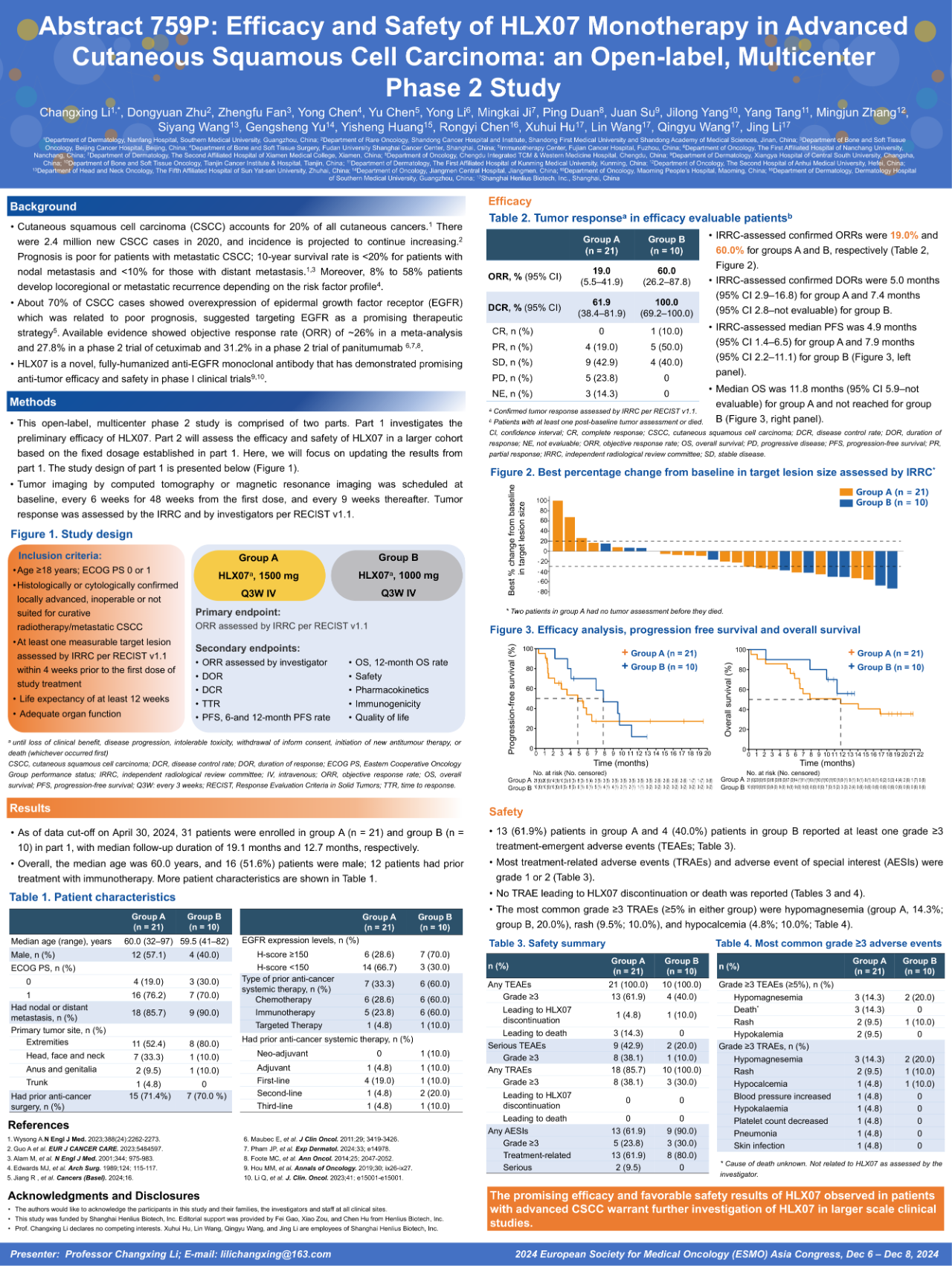 较本研究的上次数据披露,随访时间增加了8.9个月,1000 mg HLX07单药治疗继续在中国晚期皮肤鳞状细胞癌患者中展现出令人鼓舞的抗肿瘤疗效和可控的安全性。