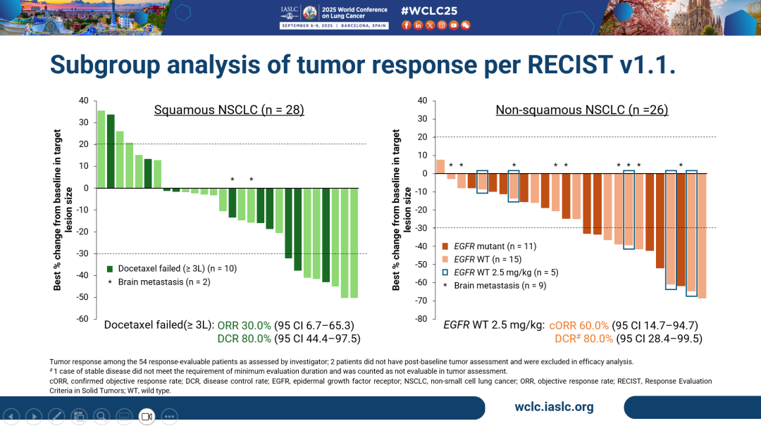 截至数据截止日期2025年6月28日,共计56例NSCLC患者入组Ia期及Ib期2.0和2.5 mg/kg剂量组,其中29例(51.8%)为鳞状,27例(48.2%)为非鳞状。鳞状NSCLC中,10例(34.5%)患者经多西他赛治疗失败。非鳞状NSCLC中,EGFR野生型/突变患者分别为15例(55.6%)及12例(44.4%)。