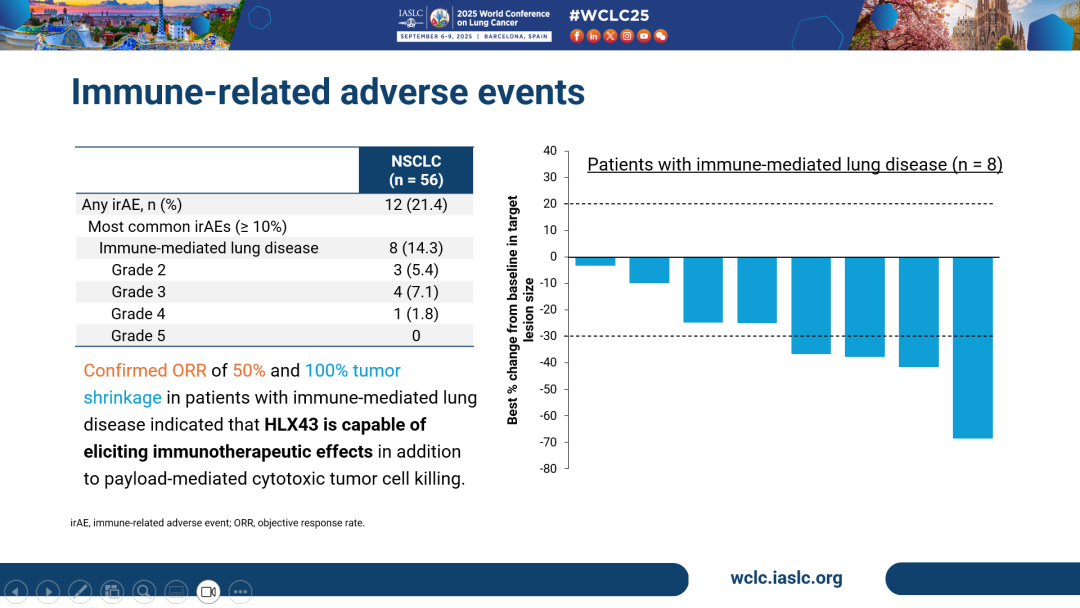同时,在发生免疫相关性肺病的患者人群中观察到更高的治疗获益,包括50.0%的cORR 及100%的肿瘤缩小率,提示HLX43可能“双管齐下”,其疗效经由小分子毒素以及免疫机制介导。