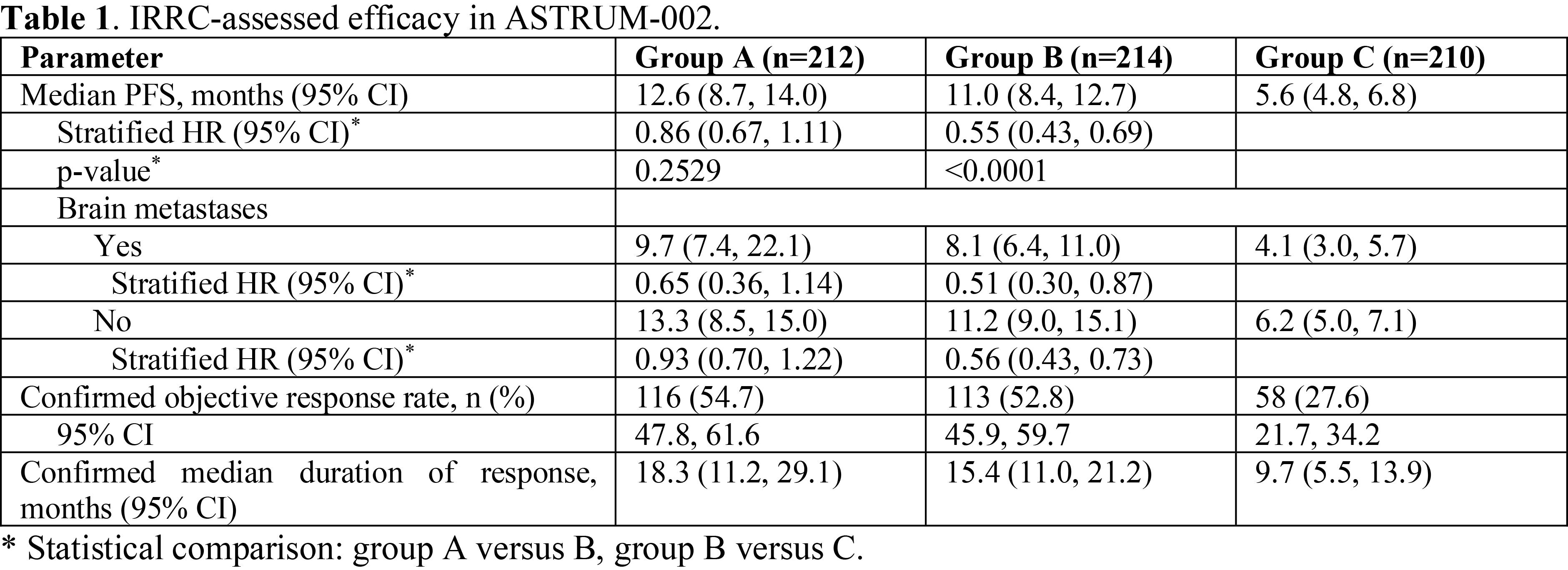 结果:从2019年11月25日至2023年6月15日(数据截止日期),636名患者被随机分配到A组(n=212)、B组(n=214)或C组(n=210)。 中位随访时间分别为23.4个月(95%置信区间,21.6-24.9)、23.1个月(95%置信区间,21.4-25.6)和23.0个月(95%置信区间,20.7-25.6)。B组中位PFS显著长于C组(11.0个月 vs. 5.6个月;分层HR=0.55,95%置信区间0.43-0.69,P < 0.0001),达到了研究方案中规定的优效标准。A组相比B组在PFS方面观察到数值上的改善(12.6个月 vs. 11.0个月,HR=0.86,95%置信区间0.67-1.11,P=0.2529)。总生存期尚未成熟。其他疗效结果见表1。导致死亡的治疗相关不良事件在三组中分别发生10例(4.7%)、5例(2.3%)和7例(3.3%)患者中。