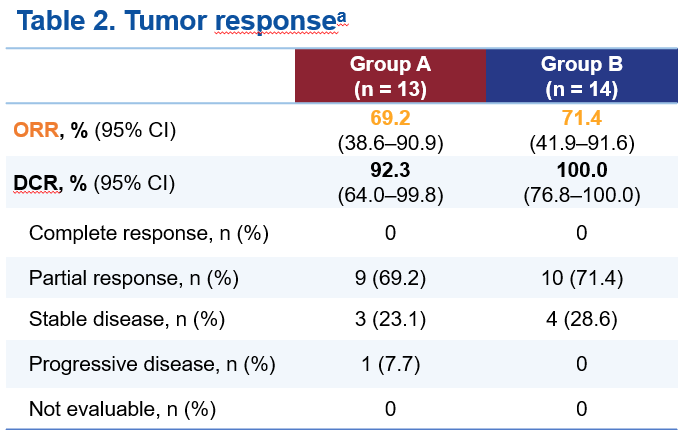 A组和B组中,独立影像评估委员会(IRRC)根据RECIST 1.1评估的确认ORR分别为69.2%(95% 置信区间[CI] 38.6–90.9)和71.4%(95% CI 41.9–91.6),疾病控制率分别为92.3%(95% CI 64.0–99.8)和100%(95% CI 76.8–100.0)。