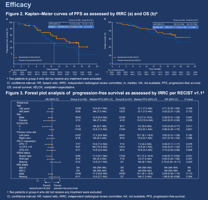 This was a randomized, double-blind, multicenter phase 2/3 study; current report will focus on the phase 2 part. Patients with unresectable metastatic/recurrent colorectal adenocarcinoma and no prior systemic therapy were randomized 1:1 to receive serplulimab (300 mg, Q3W IV) plus HLX04 (a bevacizumab biosimilar, 7.5 mg/kg, Q3W IV) and XELOX (group A) or placebo plus bevacizumab and XELOX (group B). Randomization was stratified by PD-L1 expression level (CPS <1 vs. 1≤ CPS <50 vs. CPS ≥50), ECOG PS score (0 vs. 1), and primary tumor site (left- vs. right-sided). The primary endpoint was IRRC-assessed PFS per RECIST 1.1. Secondary endpoints included other efficacy endpoints, safety, pharmacokinetics, biomarker explorations, and quality-of-life assessments.