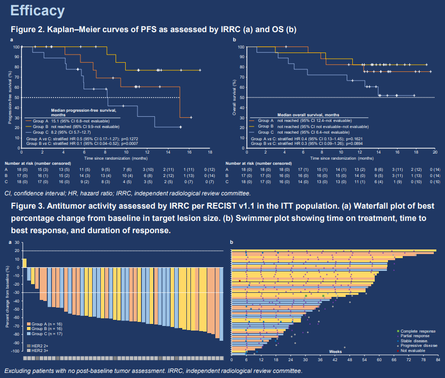 The study was unblinded 3 months after the last patient was enrolled. Patients with locally advanced or metastatic HER2-positive gastric/gastroesophageal junction (G/GEJ) cancer and had not received prior systemic antitumor therapy were enrolled. The study consisted of 2 parts; current report will focus on part 1. In part 1, patients were randomized 1:1:1 to receive HLX22 (a novel anti-HER2 monoclonal antibody) 25 mg/kg + HLX02 (a trastuzumab biosimilar) + XELOX (group A), HLX22 15 mg/kg + HLX02 + XELOX (group B), or placebo + HLX02 + XELOX (group C) in 3-week cycles. Primary endpoints were PFS and ORR assessed by IRRC per RECIST v1.1. Secondary endpoints included other efficacy measures and safety.