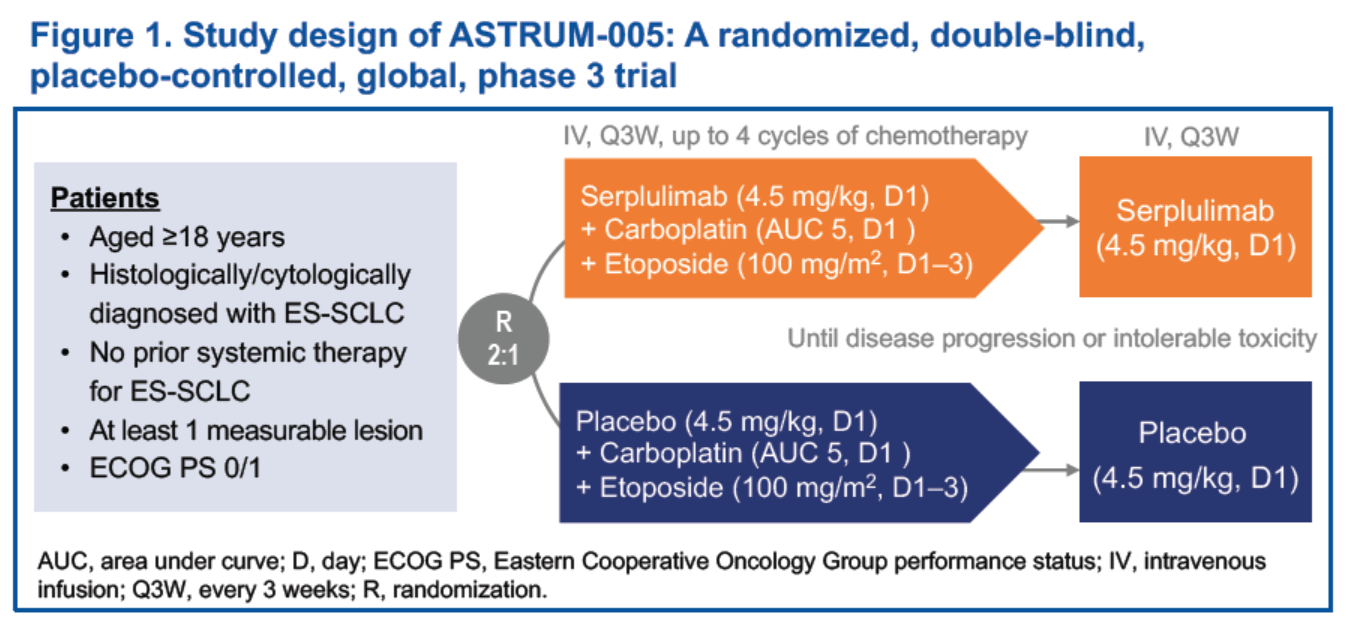 The approval of HANSIZHUANG for the treatment of ES-SCLC was primarily based on ASTRUM-005 (NCT04063163), a randomised, double-blind, international, multicentre, phase 3 study aimed to compare the efficacy and safety of serplulimab, versus placebo in combination with chemotherapy in previously untreated ES-SCLC patients. The results of ASTRUM-005 were first presented at 2022 American Society of Clinical Oncology (ASCO) Annual Meeting, and published in the Journal of the American Medical Association (JAMA), one of the top four medical journals in the world in September 2022. Thereafter, the updated results of ASTRUM-005 were released at the 2022 European Society for Medical Oncology Asia (ESMO Asia) Congress. The results of ASTRUM-005 has showed that a PD-L1 tumor proportion score (TPS)≥ 1% did not appear to be associated with better response to serplulimab plus chemotherapy. To elaborate biological characteristics of the ES-SCLC patients who has benefited from serplulimab in this study, Henlius completed an exploratory biomarker analysis to retrospectively evaluate the association of proteome signature, genetic mutations, and hematological indices with the efficacy of serplulimab.