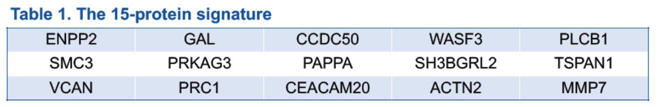 Proteomic profiling results were obtained from 168 patients (128 in the serplulimab group and 40 in the placebo group). The proteomic profiles were compared between responders and non-responders in the serplulimab group, and 181 DEP were identified. To further select the protein signature, investigators divided the patients into a training set (80 in the serplulimab group) and a validation set (48 in the serplulimab group and 40 in the placebo group). A generalized linear model selection with 5-fold validation was applied on the training set use 181 DEP and 15-protein signature was selected, which can sufficiently predict the responders from non-responders in the serplulimab group.