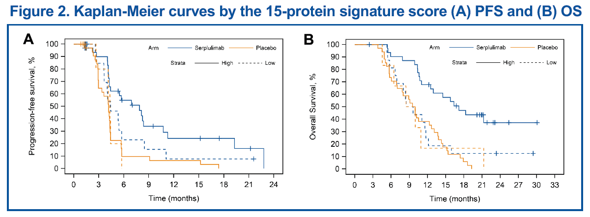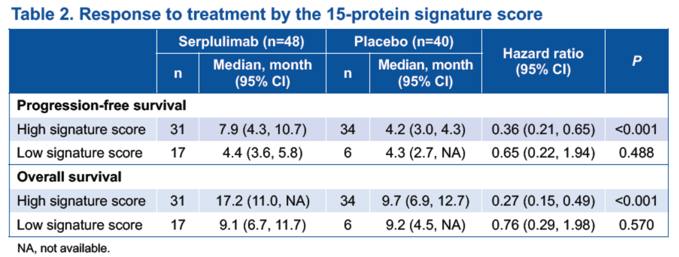 The predictive model based on the 15-protein signature showed an AUC of 0.982 in the training set, and 0.918 and 0.545 in the validation sets for the serplulimab and the placebo groups, respectively. Patients with high signature scores, which were generated from the protein set analysis of the 15-protein signature, derived benefits from adding serplulimab to chemotherapy in terms of PFS and OS (Table 2 and Figure 2), while those with low signature scores did not appear to derive benefits.