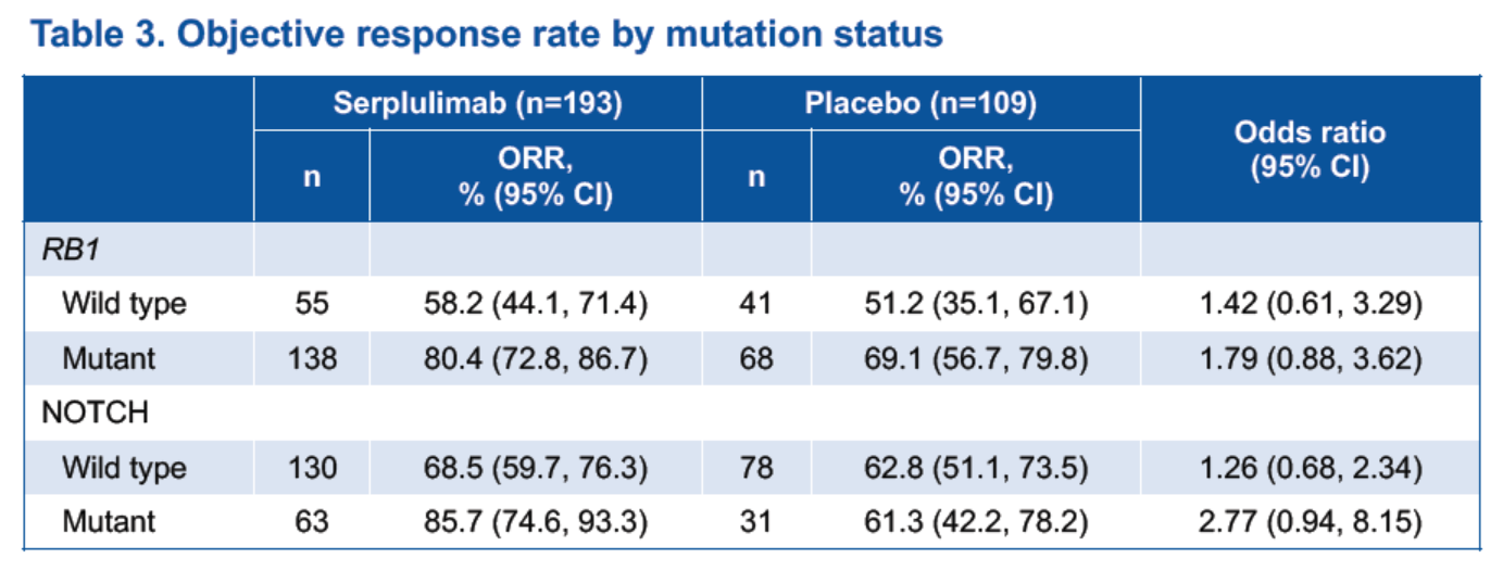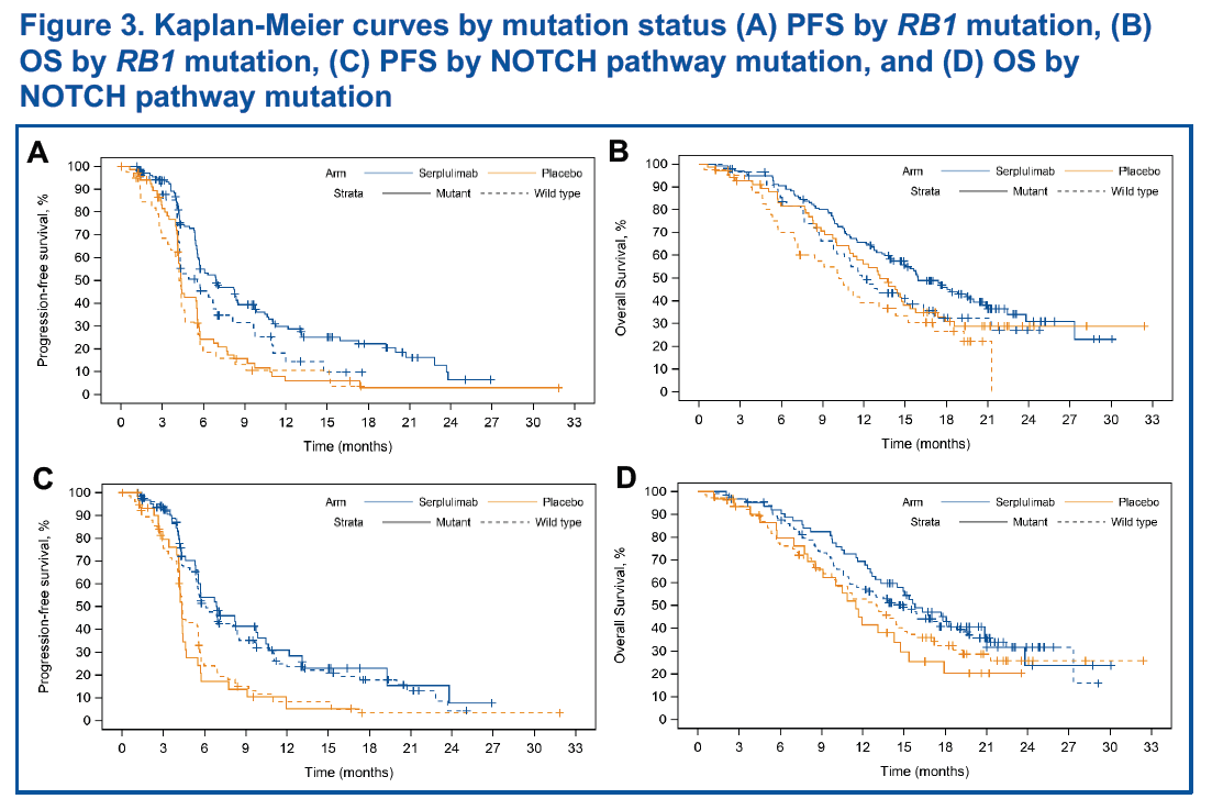 Genetic mutation data were available for 305 patients. After excluding 3 outliers, 302 patients were included in the analysis. Patients with mutations in the RB1 gene or the NOTCH pathway had higher response rates to serplulimab-chemotherapy compared with those without mutations (Table 3). While Patients with RB1 mutations and treated with serplulimab-chemotherapy had a tendency towards longer PFS and OS (Figure 3).