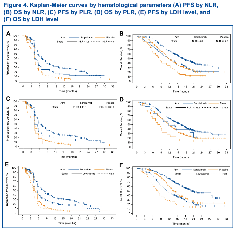 Among all 585 patients, 583 had available test results for NLR and PLR, while 582 had available test results for LDH. The analysis results indicated that high levels of baseline NLR, PLR, and LDH level were correlated with shorter PFS and OS in both treatment groups (Figure 4), implicating these are potential prognostic biomarkers for SCLC and correlate with poor patient prognosis.