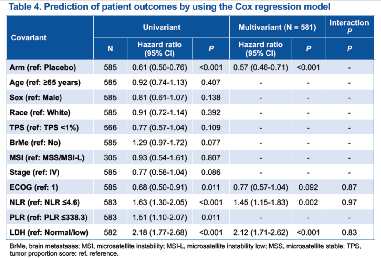 For hematological parameters, the optimal cutoffs to predict efficacy were determined using X-tile[1]. And multivariate Cox regression was conducted to identify independent biomarkers.